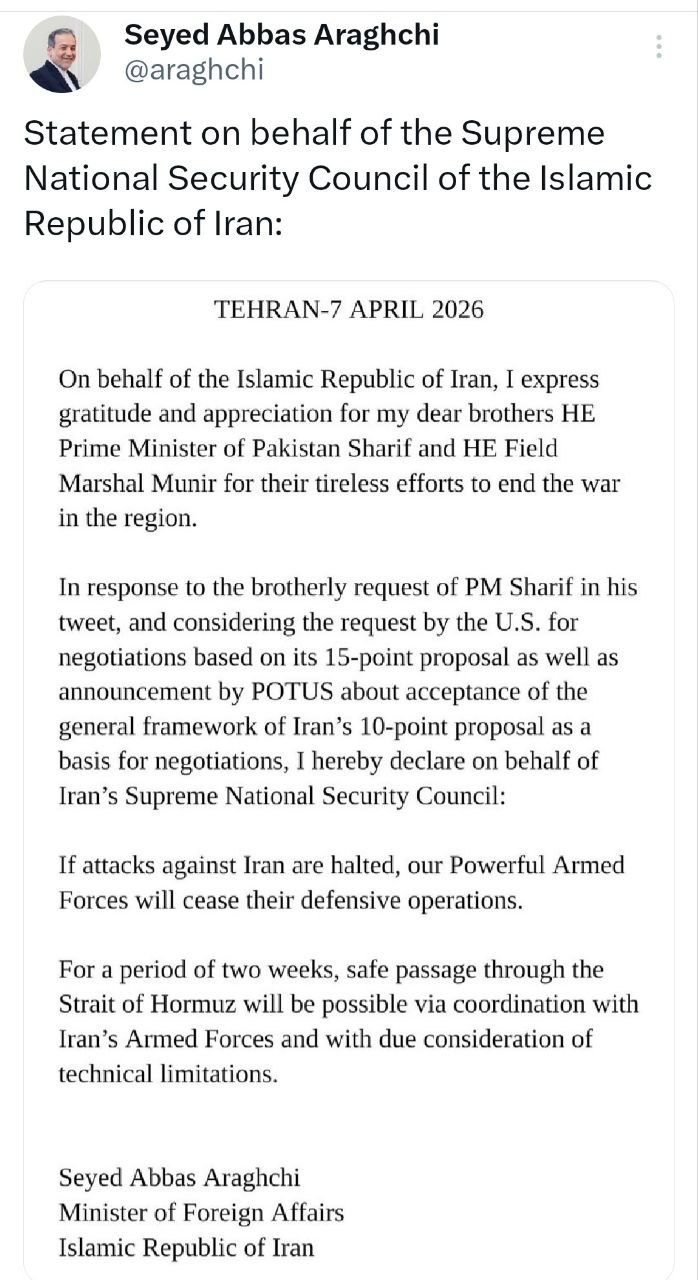 پیام سید عباس عراقچی وزیر امور خارجه جمهوری اسلامی ایران به نمایندگی از شورای عالی امنیت ملی
