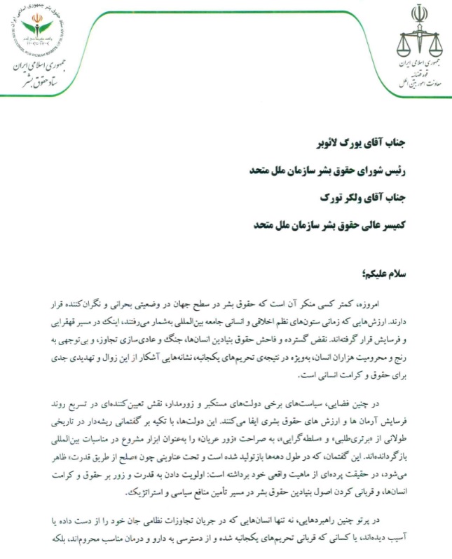 نامه دبیر ستاد حقوق بشر به رئیس شورای حقوق بشر و کمیسر عالی حقوق بشر